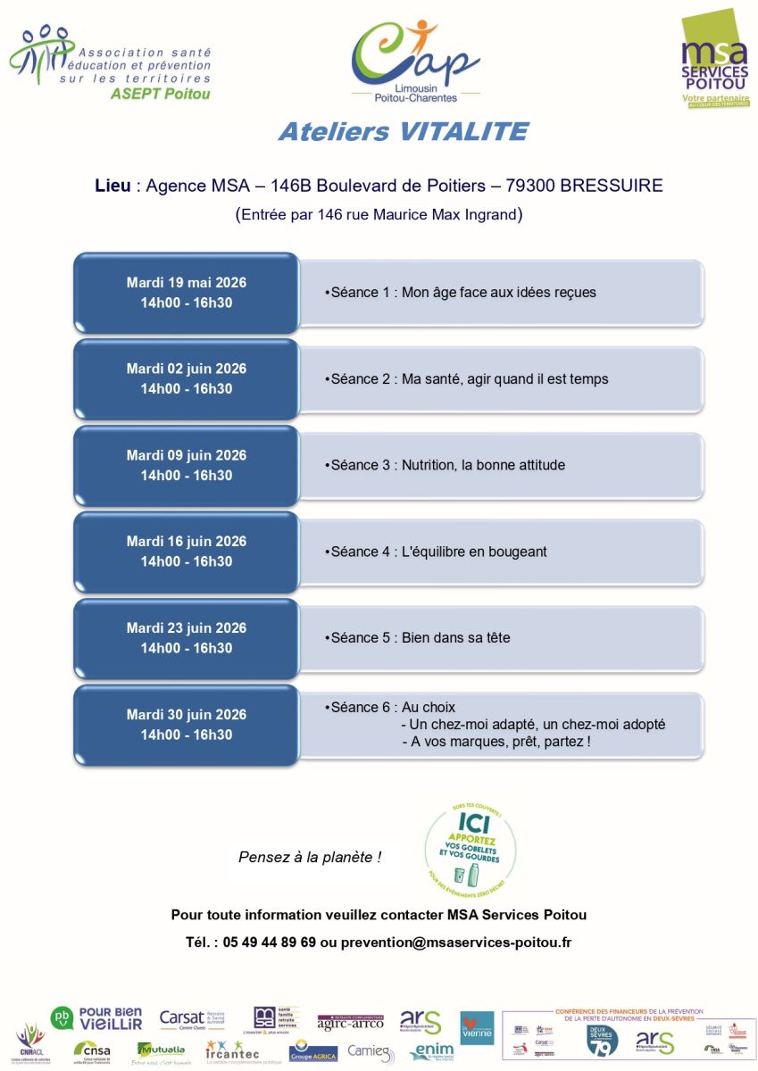 Les ateliers VITALITE se composent de 6 séances hebdomadaires de 2h30 par groupe de 10 à 15 personnes.