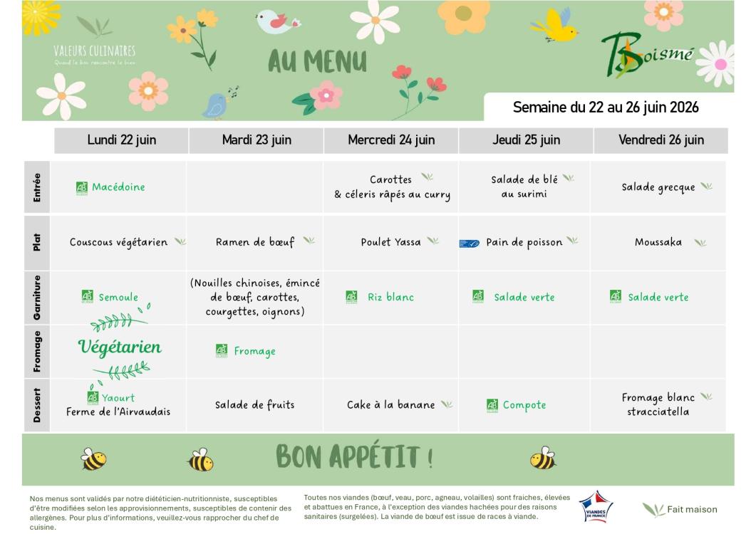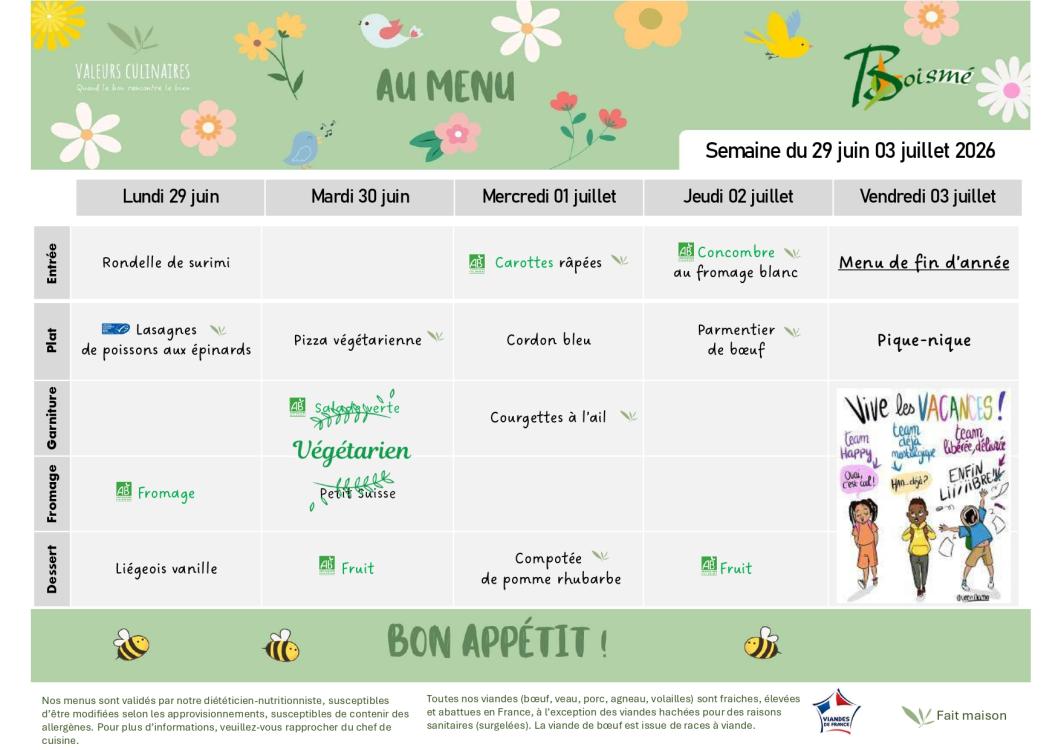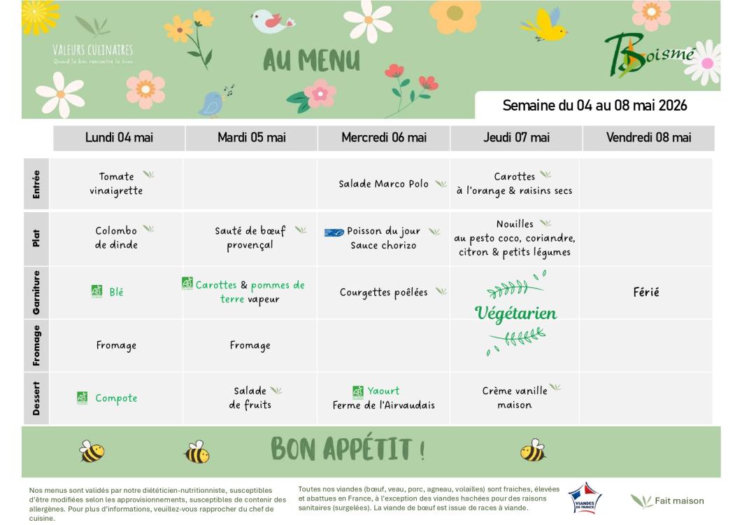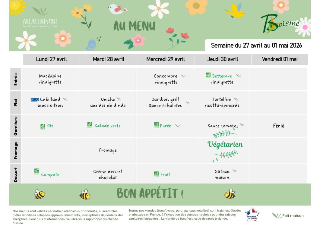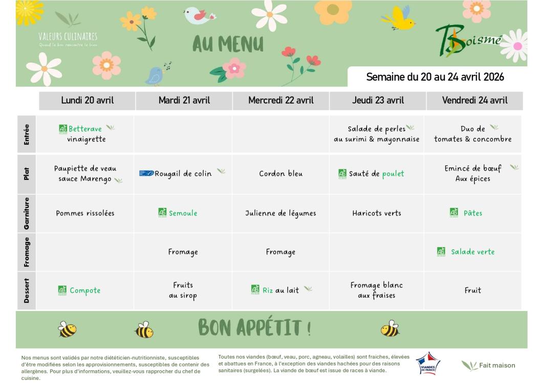 Menu cantine du 20 avril 2026 au 03 juillet 2026.